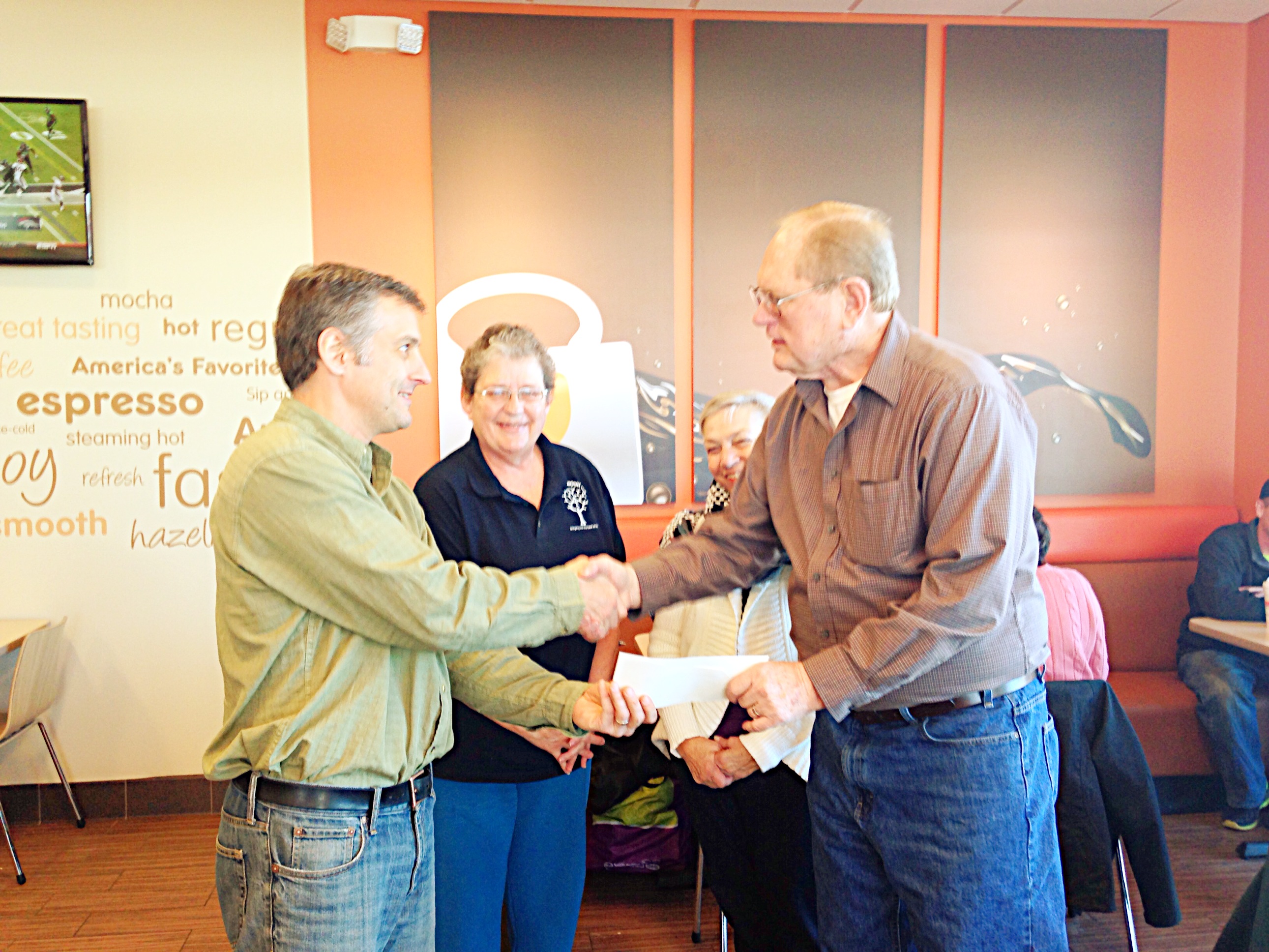 Franchise owner, Josh Blanchard, handing the check over to Optimist Club President Al Schuppert as Optimist Club treasurer Darlene Walter and Edgewater Mayor Bonnie McNulty look on.